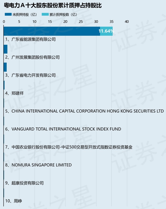 截止本公告日,股东广东省能源集团有限公司已累计质押股份4.12亿股,占其持股总数的11.64%。本次质押后粤电力A十大股东的累计质押股份占持股比例(占持股比例的计算以公司最新一期财务报表公布的十大股东的持股总数为基准)见下图: